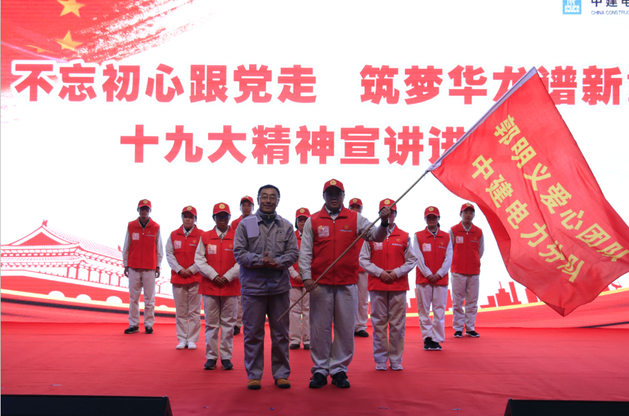 过程中,郭明义携爱心团队作郭明义先进事迹报告,授旗成立郭明义爱心团队中建电力爱心分队,现场捐赠困难职工1万元,并为中建电力广西防城港华龙一号核电项目雷锋学堂成立揭牌。