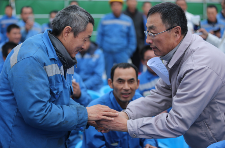郭明义的报告时而激情澎湃,时而亲切温暖,两个小时的报告会上掌声此起彼伏,延绵不息。“郭师傅,听了您的报告,我感到十分振奋。同为一名基层工人,您把我们对十九大精神的学习感悟都讲出来了,新时代的中国更值得咱们老百姓期待。”报告结束后,该项目焊培学院的老教练吴世军激动地握着郭明义的手。“是啊,中国共产党存在的意义就是为人民服务的,这点在习总书记的十九大报告中体现的非常准确,这样的新时代太值得我们老百姓期待了,我们一定要永远跟党走!”郭明义握紧老吴的手。