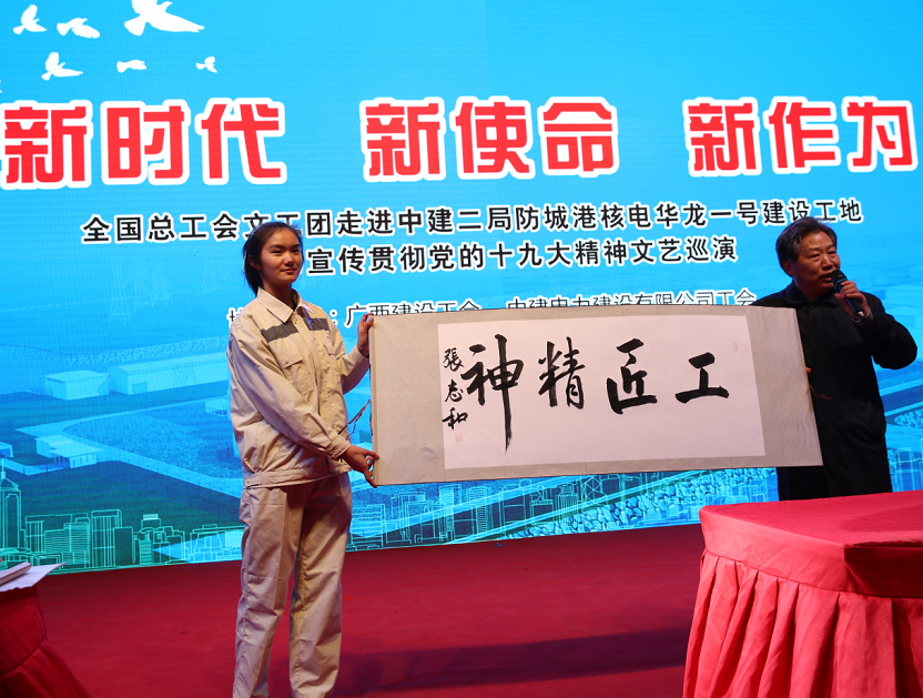 同日,为持续深入开展学习宣传贯彻十九大精神,全总文工团再次来到中建二局广西防城港华龙一号核电项目,进行了主题为“新时代 新使命 新作为”的文艺演出。精彩节目在传播新时代好声音的同时,也给劳务工朋友们送来了一场听觉、视觉、感觉上的艺术盛宴,不时引起场下声声叫好和阵阵掌声。