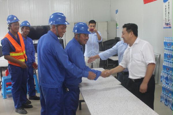 本网讯 近日,公司党委副书记、纪委书记、工会主席聂宏凯冒着细雨赴广西LNG项目,为广大员工送去救灾慰问金和防暑降温用品。