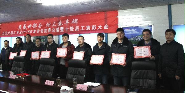 本网讯 1月12日,西安大都汇项目开展2015年度劳动竞赛总结暨十佳员工表彰大会。公司党委副书记、纪委书记、工会主席聂宏凯,纪委副书记、工会副主席、党群工作部部长孙昭鹏一行及项目全体员工、劳务工代表参加了会议。