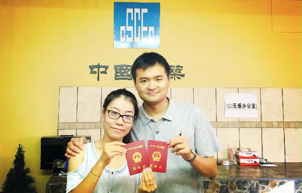 本网讯 “我们结婚啦!”1月22日,纳米比亚湖山铀矿项目员工彭强和刘纪彤在中国驻纳米比亚大使馆注册结婚,成为首对在驻纳大使馆领证的中建夫妻。