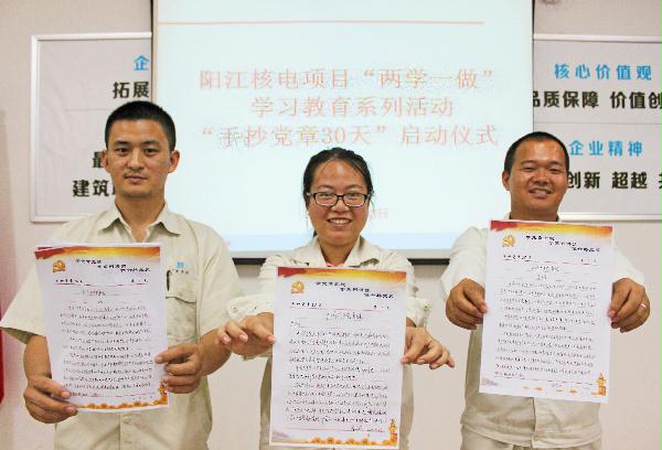 本网讯 5月23日,阳江核电项目召开“两学一做·手抄党章”活动正式启动,启动会上,项目全体党员集中学习了《中国共产党章程》,并手抄党章前三段共339字。