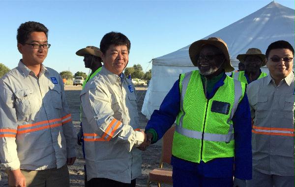 公司总经理助理、纳米比亚项目经理闫金锋及项目领导与纳米比亚开国总统努乔马(右二)亲切握手