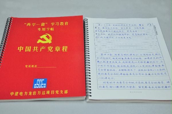 本网讯 近日,龙岩万达广场项目开展“笔尖上的‘两学一做’”活动,为全体党员配置“两学一做”学习教育专用字帖,用于党章党规、习近平总书记系列重要讲话的临摹抄写。
