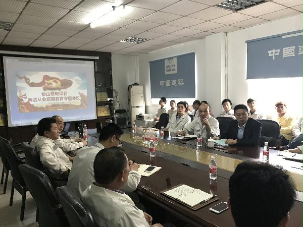 本网讯 近日,公司纪检监察部一行赴台山核电、阳江核电、梅州万达广场等多个基层项目召开廉洁从业震撼教育专题会。项目中层以上领导,财务、商务、物资、人力资源等关键部门员工,以及各分包劳务班组长参加会议。 会议首先传达了局、公司2017年党的建设暨党风廉政建设和反腐败工作会议精神,层层压实责任,抓实会议任务;随后,公司结合项目施工的实际情况,针对可能存在的“隐性腐败”问题,将以往的典型腐败案例与参会人员进行了交流,充分强调了廉洁纪律的重要性,为大家敲响警钟,起到了震撼的警示教育作用;最后,针对目前廉洁纪律的形势,公司纪委要求各项目人员要提高防腐拒变能力,时时刻刻绷紧廉洁从业这根弦,不放松,杜绝形式主义,真抓实干,共推项目和谐健康发展。(谢泽桦 杨瑞)