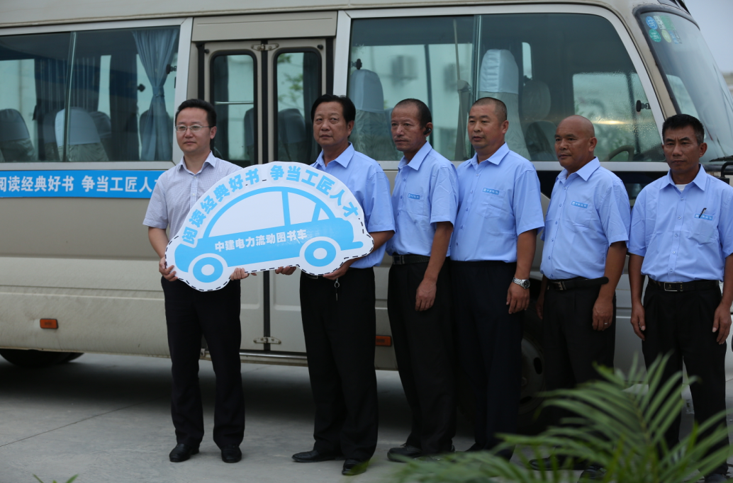 中建电力程惠敏书记致欢迎词 全国总工会职工书屋办公室主任张爱民 流动图书车挂牌 全国总工会职工书屋办公室主任张爱民、广西建设工会主任王伟华为项目“全国模范职工小家”创建揭牌